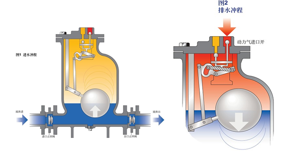 液體(tǐ)通過進口止回閥,在重力作(zuò)用(yòng)下進入泵内,使浮球上升。浮球上升到上限後,供給閥打開,蒸汽或壓縮空氣進入泵内,逐漸向泵内施加壓力,直到足以克服反壓力。加壓液體(tǐ)打開出口止回閥,開始排出液體(tǐ)。當浮球下降到較低的位置時,供給閥關閉,堵塞蒸汽或壓縮空氣,同時打開排氣閥,泵内的壓力就會降低。此時液體(tǐ)重新(xīn)填滿泵腔。